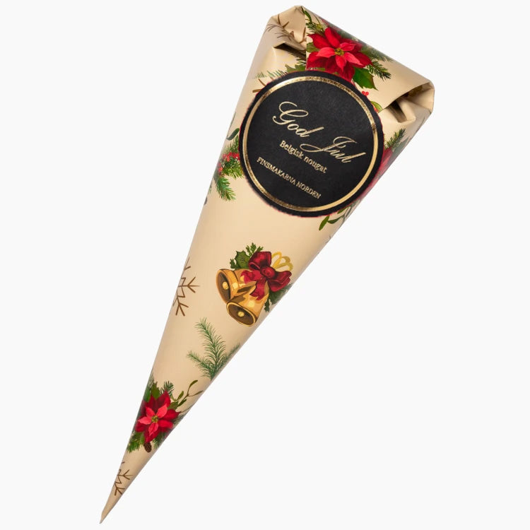 Belgiska praliner – Gianduja hasselnötsnougat med budskap “God Jul” i strut med mönster av julklockor. Vikt 50g.